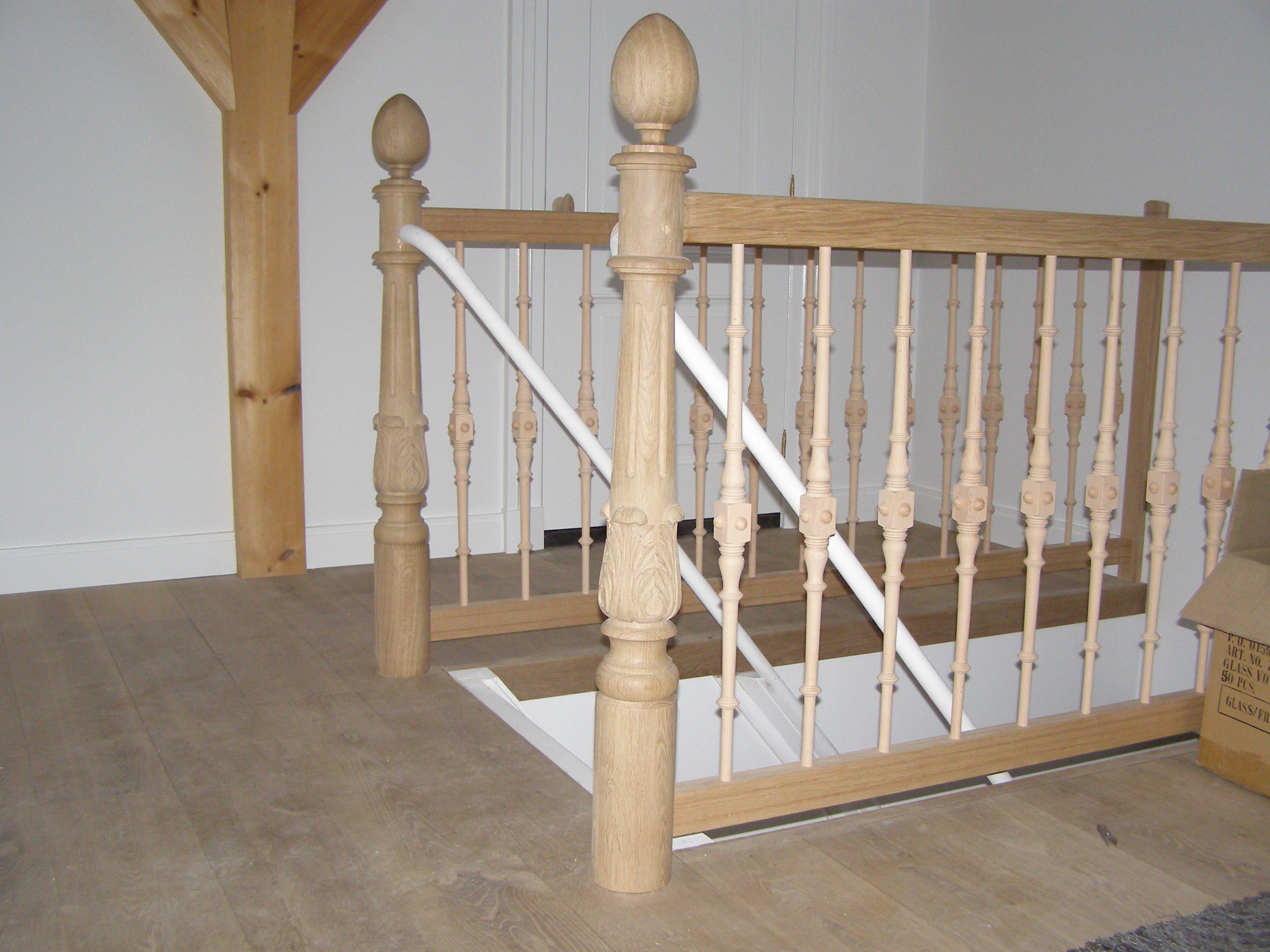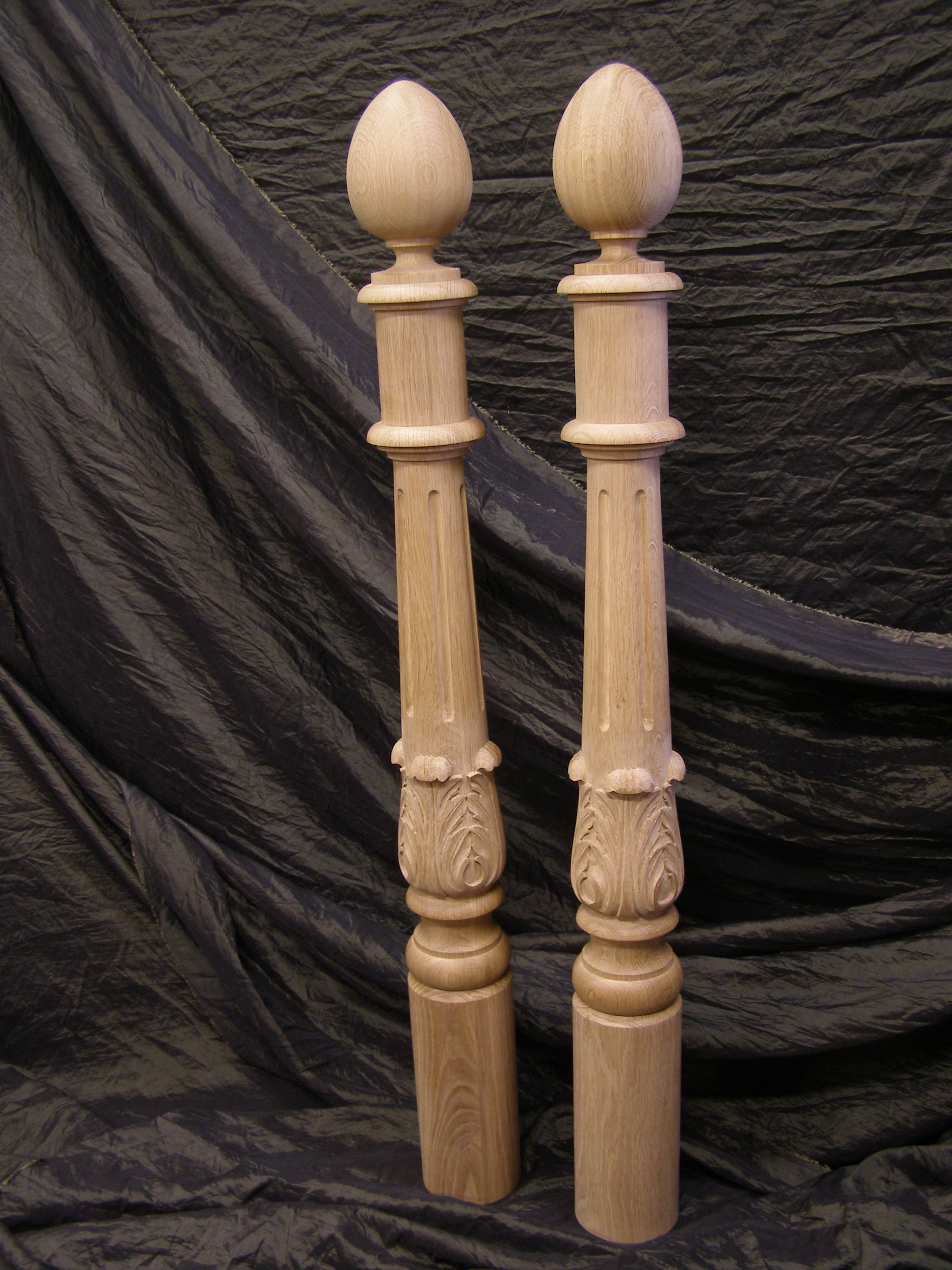 Deze hoofdbalusters voor een trap zijn gedraaid in eikenhout waarna er in de voet acanthusbladen zijn gesneden. De balusters zijn een reconstructie, de oorspronkelijke balusters zijn verwoest in een brand. Aan de hand van een foto is het ontwerp gemaakt.