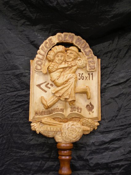 Deze staf is gemaakt om gebruikt te worden tijdens het carnaval bij de boerenbruiloft in Venlo. Het logo van de boerenbruiloft, die georganiseerd wordt door het College den Hulster uit Venlo, is uitgewerkt in de staf. Je ziet het bruidspaar dat in de onecht verbonden wordt, de boerenkool met worst, een leerboek, potlood en lineaal en de logo’s van het college en de carnavalsvereniging.