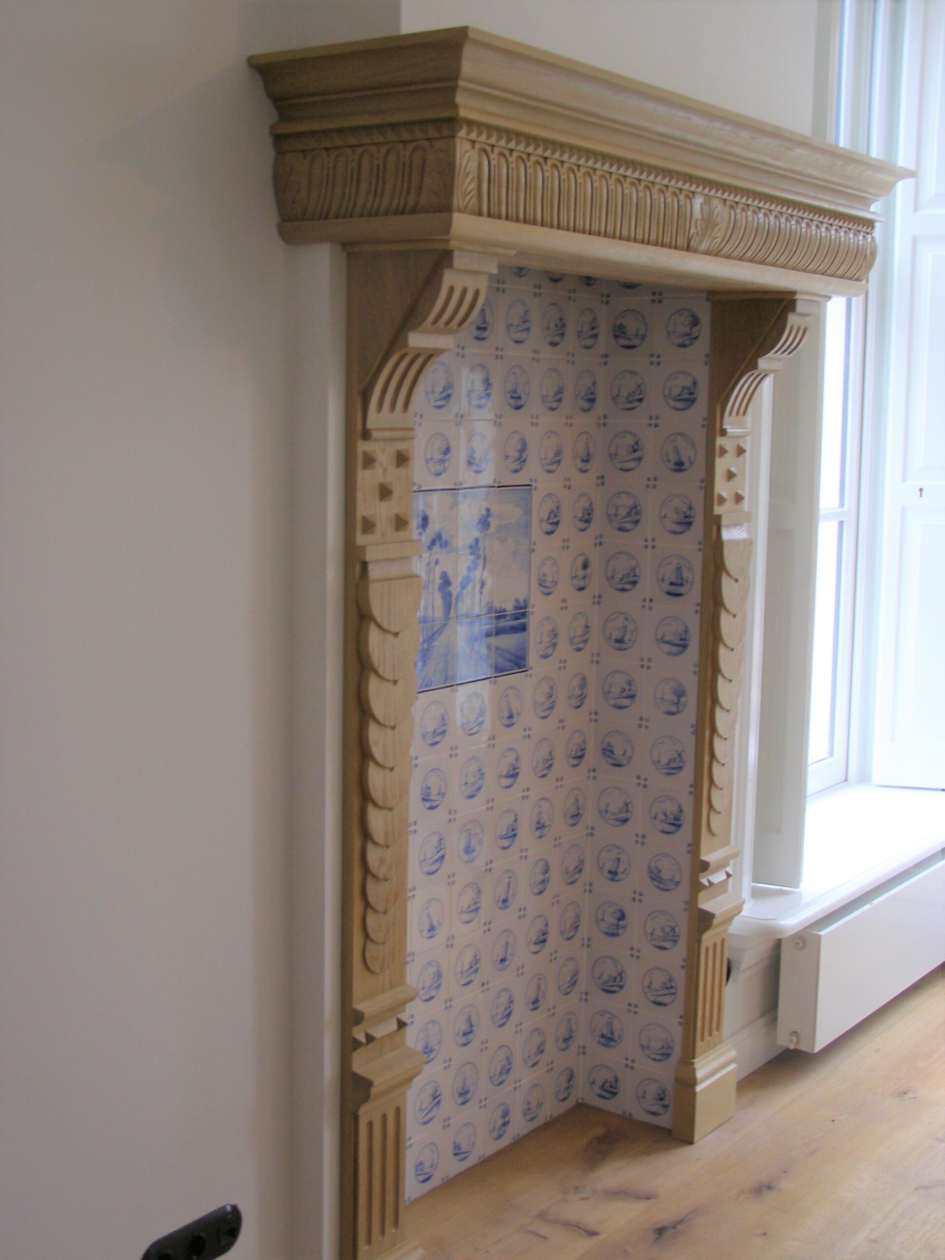 Na een brand die een groot deel van het interieur van een 19e eeuws huis verwoestte is deze schouw aan de hand van nog aanwezige foto’s gereconstrueerd. De schouw is uitgevoerd in eikenhout en is niet zoals de oorspronkelijke schouw donker gebeitst maar blank afgewerkt zodat de kamer een lichte uitstraling behoudt.