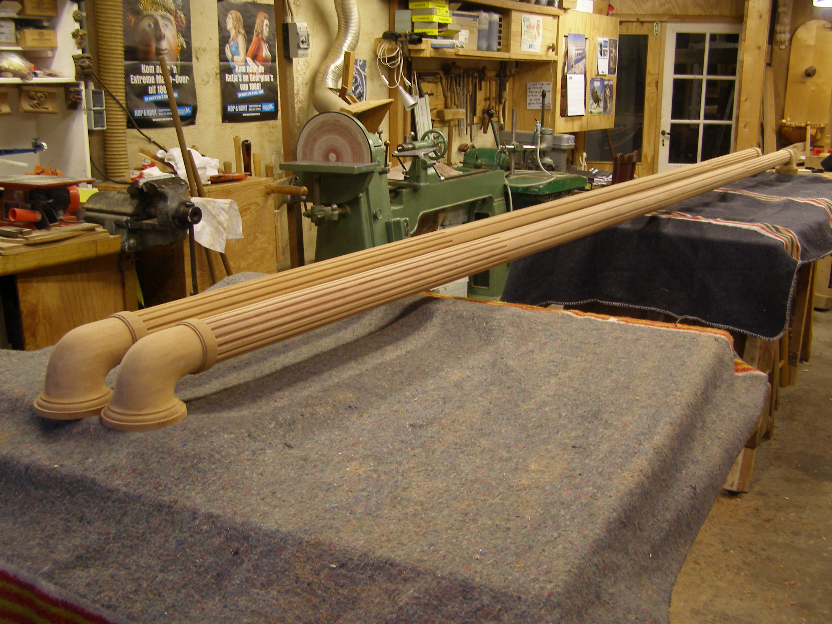Voor het Concertgebouw de Vereeniging in Nijmegen zijn deze trapleuningen gemaakt. Na de recente restauratie van de Vereeniging bleek de balustrade van een trap niet veilig genoeg. Gekozen is om een leuning te plaatsen in de stijl van andere in het gebouw aanwezige trapleuningen in mahoniehout. Op de foto’s zijn een voorbeeld van een originele trapleuning en de twee nieuwe trapleuningen te zien in de werkplaats .