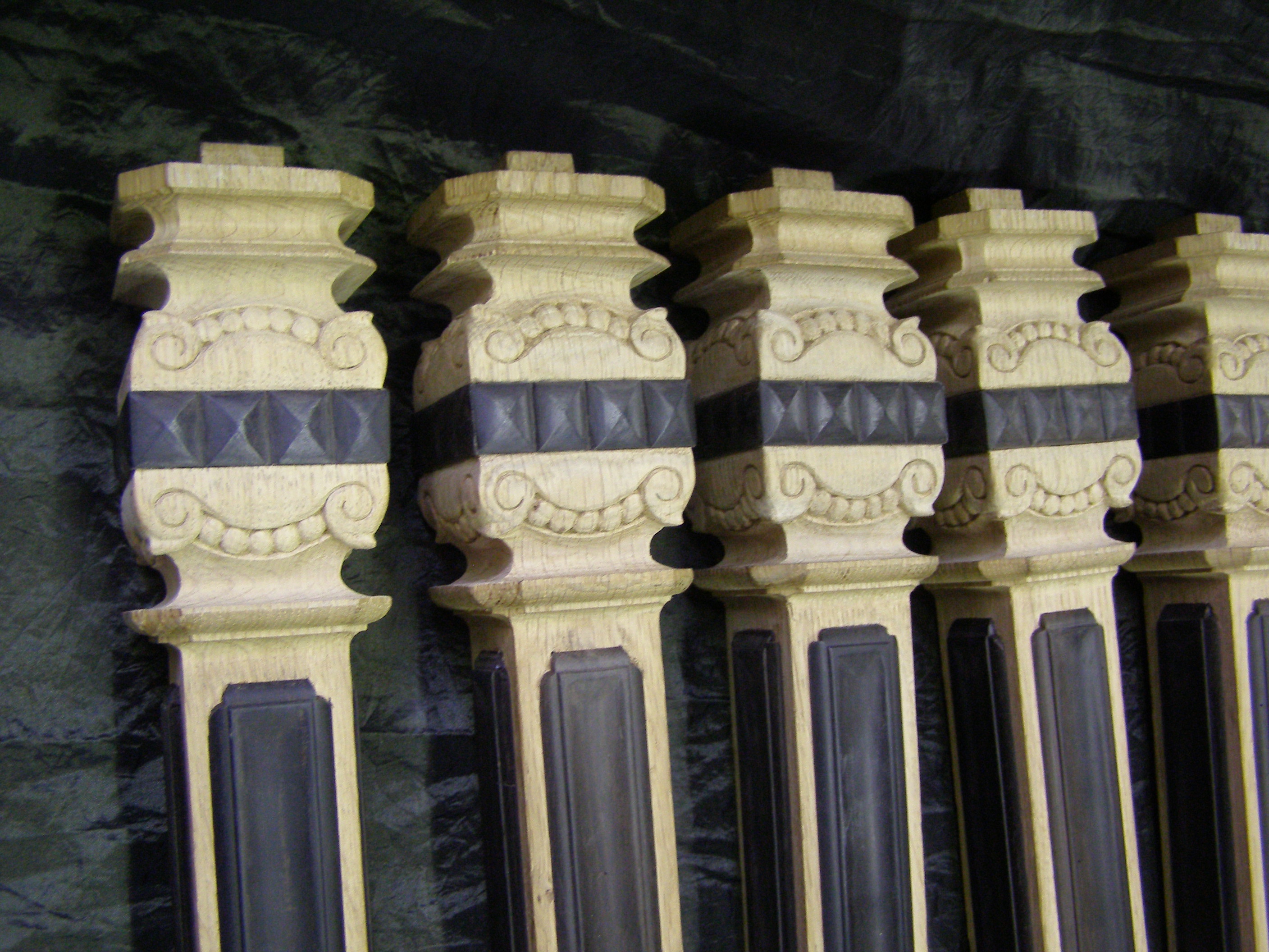 Deze hoofdbalusters voor een trap zijn gedraaid in eikenhout waarna er in de voet acanthusbladen zijn gesneden. De balusters zijn een reconstructie, de oorspronkelijke balusters zijn verwoest in een brand. Aan de hand van een foto is het ontwerp gemaakt.