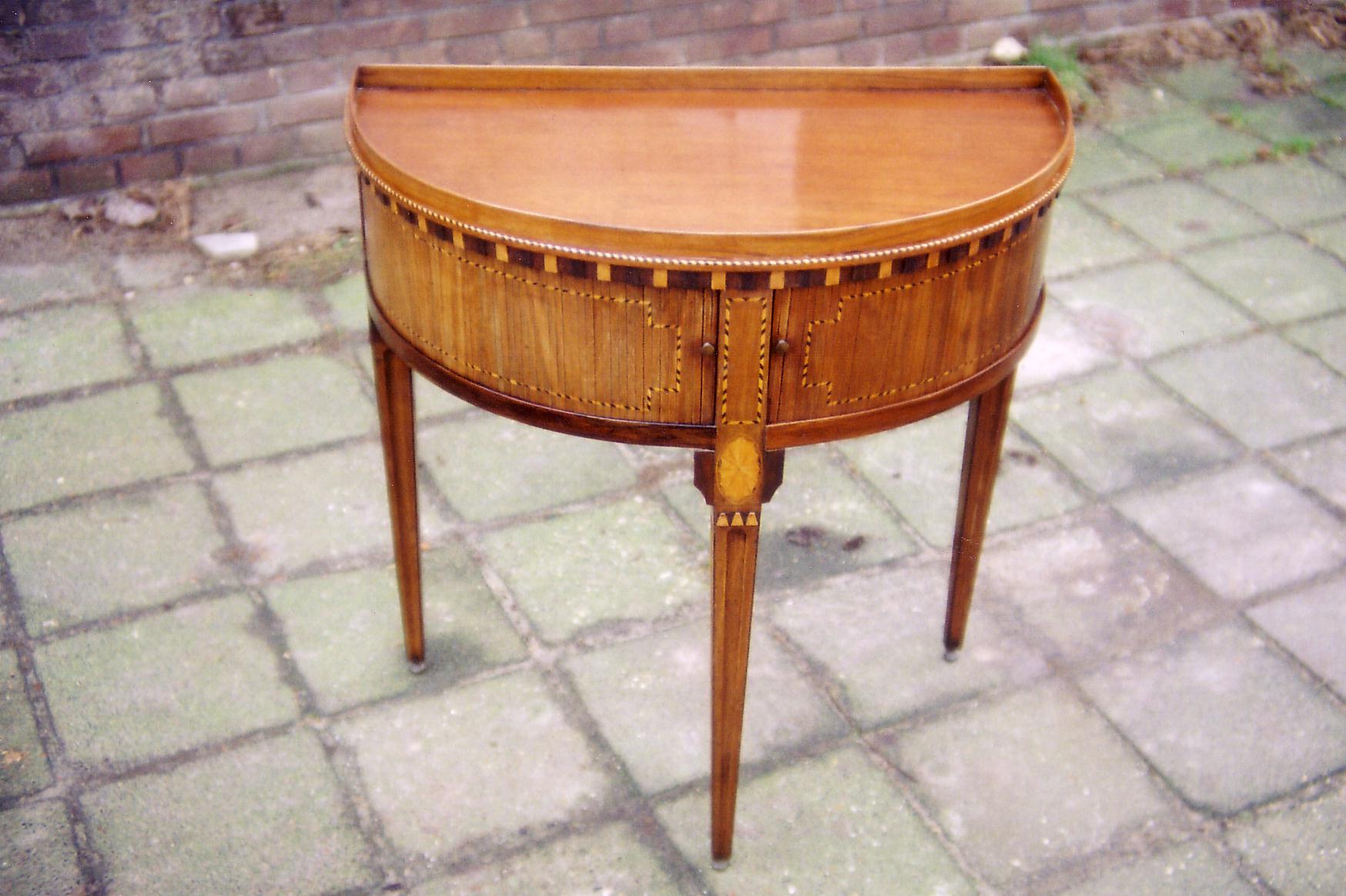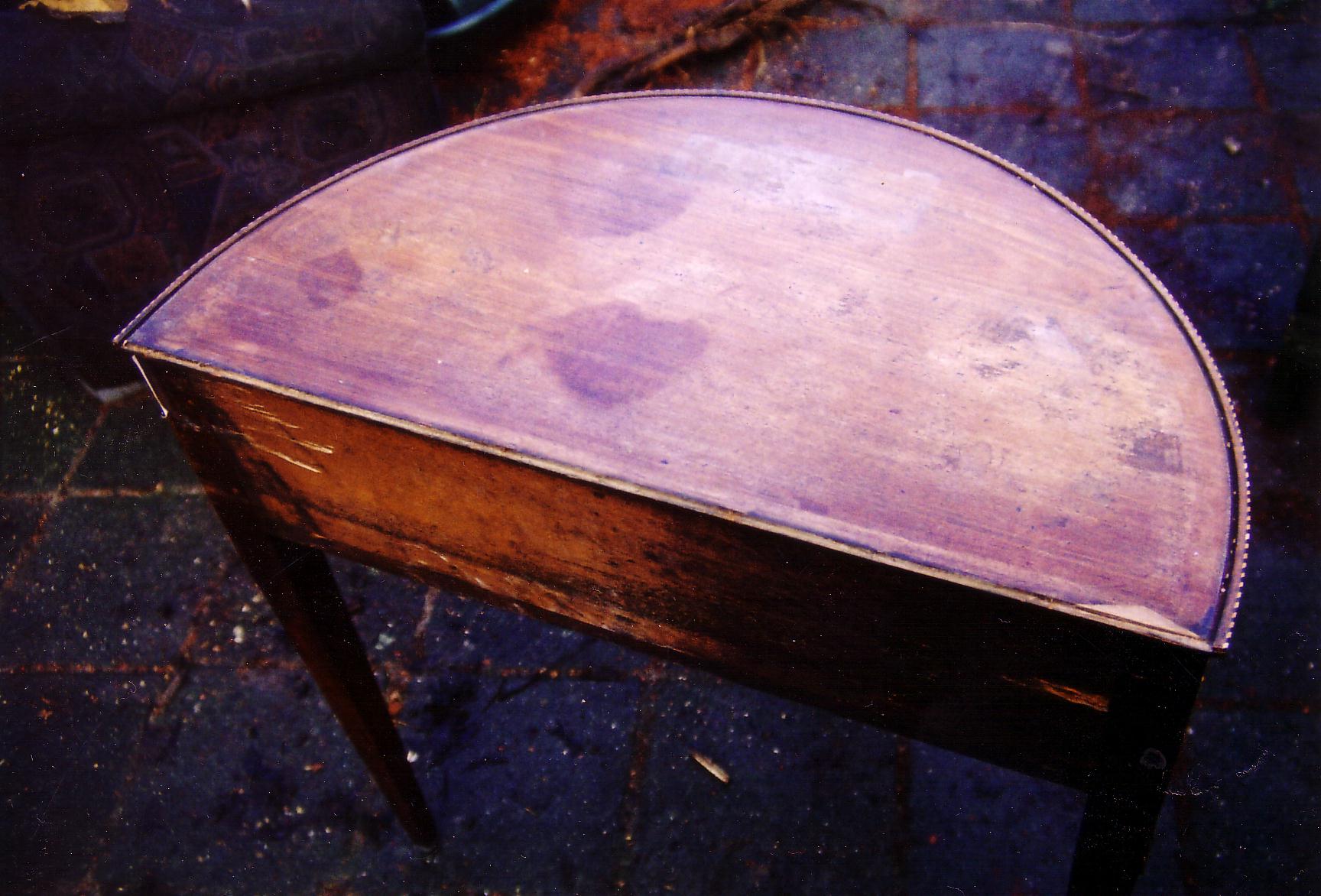Halfrond tafeltje van mahoniehout (ca 1830) voor de restauratie. , Het tafeltje na de restauratie; het blad is opnieuw gepolitoerd en het blad is hersteld.