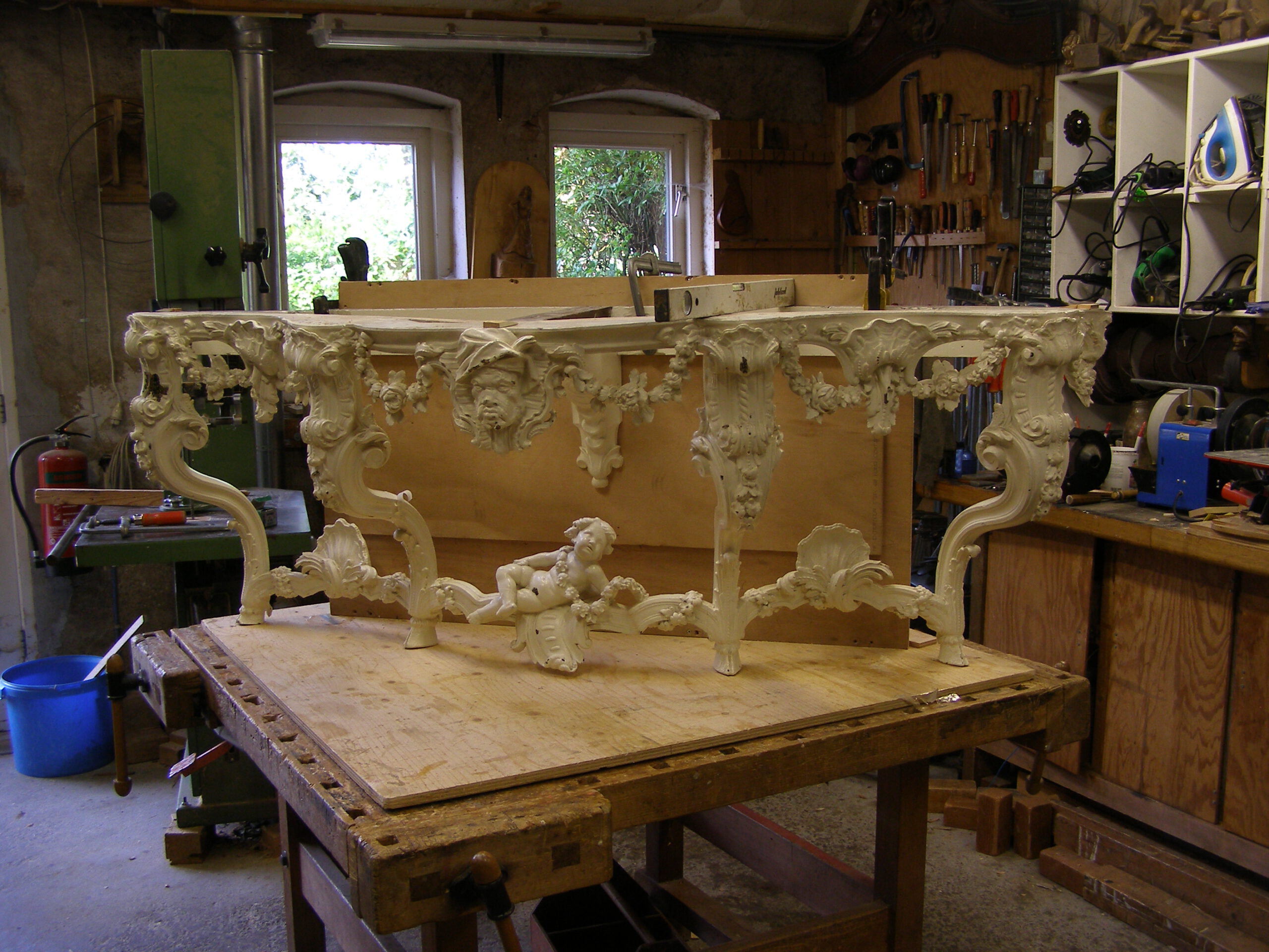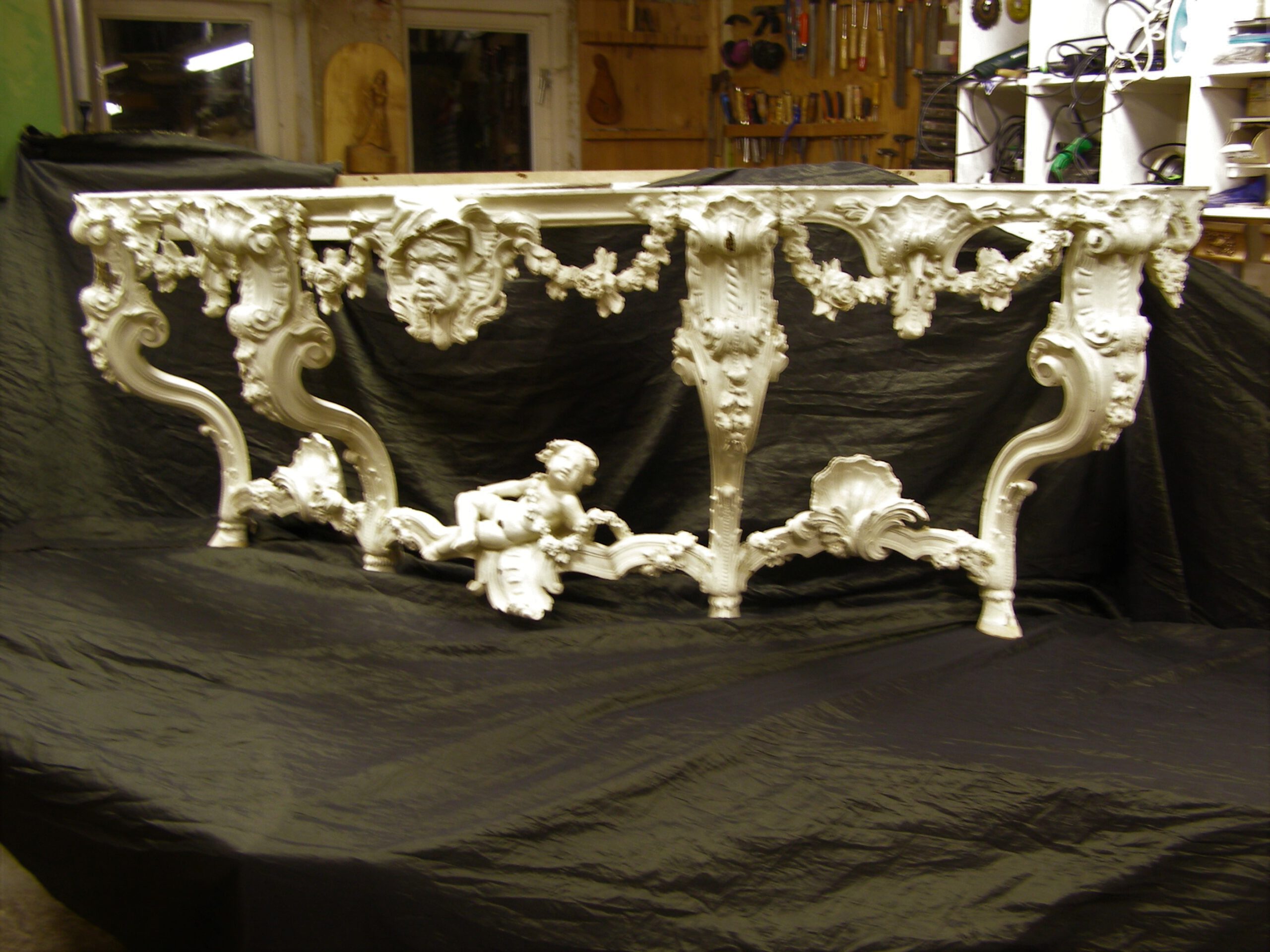 Op de foto’s is de consoletafel te zien voor de restauratie, tijdens de demontage en na de restauratie. Na de restauratie werd de tafel opnieuw geschilderd en verguld.